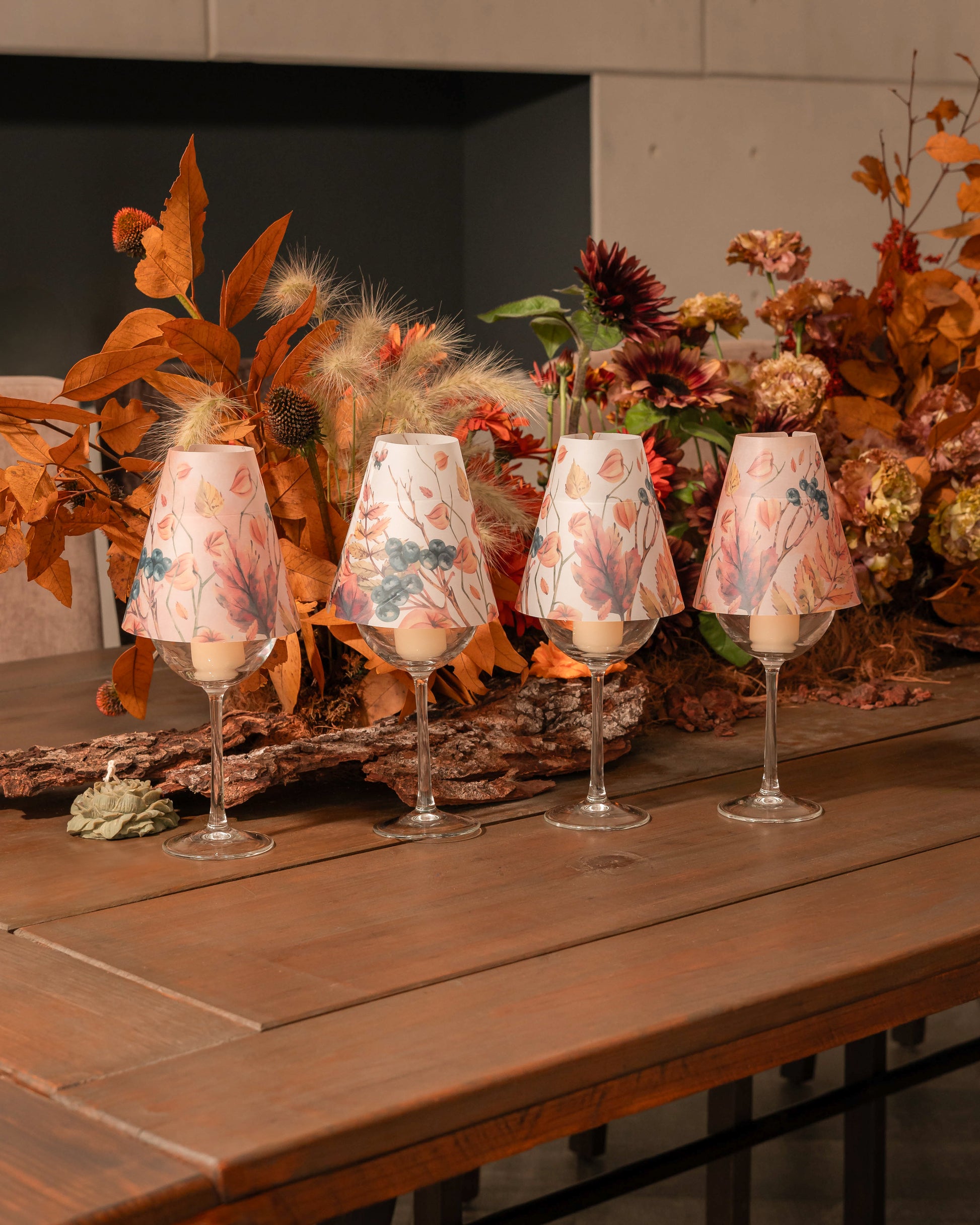 4 Pantallas para convertir tus copas en candelabros. Simplemente mete una vela tipo tea light de pilas dentro de la copa, arma la pantalla y crea una atmósfera maravillosa en tu celebración. Las copas y velas no están incluidas.