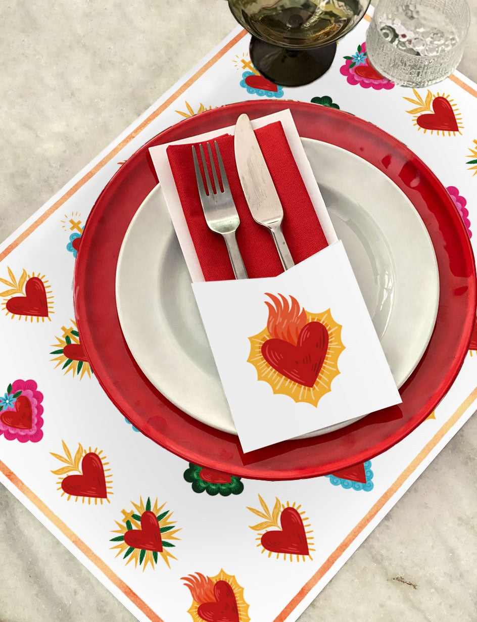 Incluye: Individuales de 32x44 cm en papel bond 140 g, Servilletas de 20 x 20 cm calidad tela y sobres de cartón para cubiertos.
